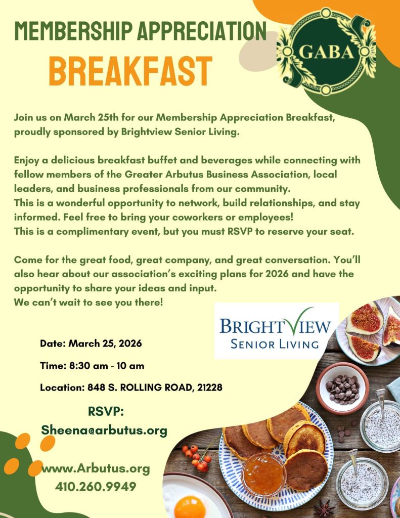 Enjoy a delicious breakfast buffet and beverages while connecting with fellow members of the Greater Arbutus Business Association, local leaders, and business professionals from our community. This is a wonderful opportunity to network, build relationships, and stay informed. Feel free to bring your coworkers or employees! This is a complimentary event, but you must RSVP to reserve your seat.